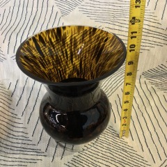Hand-blown art glass vase featuring an amber body with a black or dark brown "tortoise shell" or striped pattern