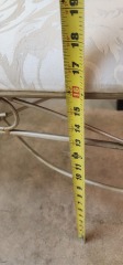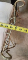 Beautiful and ornate bench featuring a lightly distressed paint finish and a comfortable seat.