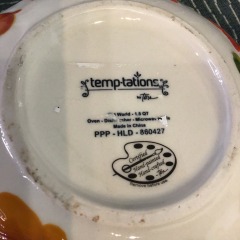 Temp-tations Fall Harvest dinnerware set in the Old World pattern. set in cludes 1 Temptations Harvest Covered Butter Dish 3D Fall Leaves, 1 Temp-tations Fall Harvest Acorn Leaves Serving Bowls Set of 2 – 3QT & 1 QT, 1 Temp-tations PPP-HLD-860427 Old World 1.5 Qt. Fall Harvest Leaves Serving Bowl, 1 cup, and 4 plates