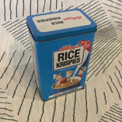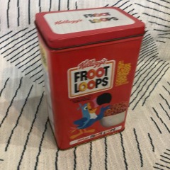 collection of vintage advertising tins includes iconic brands such as Kellogg's Froot Loops, Rice Krispies, Log Cabin Syrup, and Pollard's Acid Drops. These decorative tins are sought-after collectibles, often used for storage or as retro kitchen decor. While functional, their primary appeal today is as collectible memorabilia.