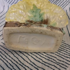 McCoy Yellow Chrysanthemum flower-form pottery vase. Known for its distinctive figural design featuring three large chrysanthemum blooms, this model was primarily produced during the 1950s