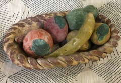 vintage Mexican terracotta fruit bowl centerpiece, a classic example of Latin American folk art often produced in the mid-to-late 20th century. These handcrafted sets typically feature a braided-style oval bowl filled with various oversized clay fruits like bananas, apples, and oranges.