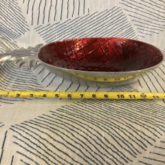 pineapple-shaped metal serving bowl featuring a vibrant red enamel interior with a textured lattice or diamond pattern