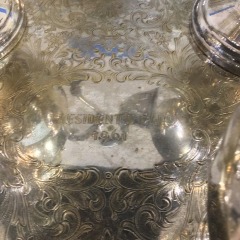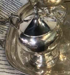 Vintage Silverplate Tea Set Coffee Service Serving Tray Tea Pot Cream Sugar Bowl. Handle is broke off of sugar dish and is located on the inside of dish.